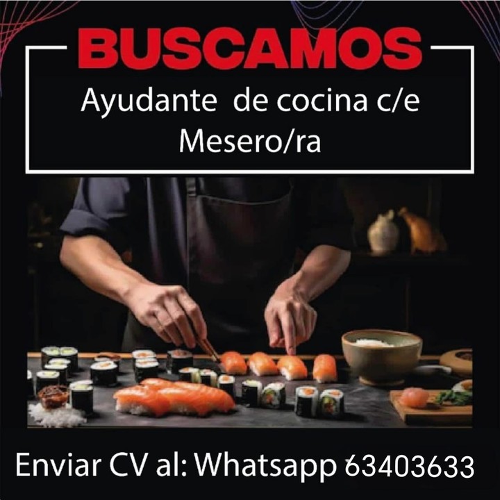 BUSCAMOS PERSONAL PARA RESTAURANTE:| - ayudante de cocina con experiencia - mesero/mesera. Enviar CV al 63403633 por WhatsApp (B000433444)