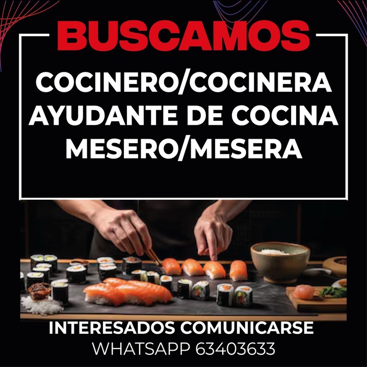 BUSCAMOS PERSONAL PARA RESTAURANTE| : *Cocinero con experiencia- ayudante de cocina con experiencia • Mesero/Mesera. Enviar CV al 63403633 por WhatsApp (B000433880)