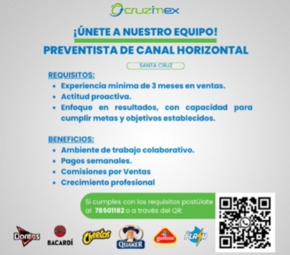 CRUZIMEX BUSCA PREVENTISTAS PARA| venta de productos y marcas líderes del mercado. Sueldo base + comisiones + bonos por metas. Enviar CV al Whatsapp: 76690074 (B000434472)