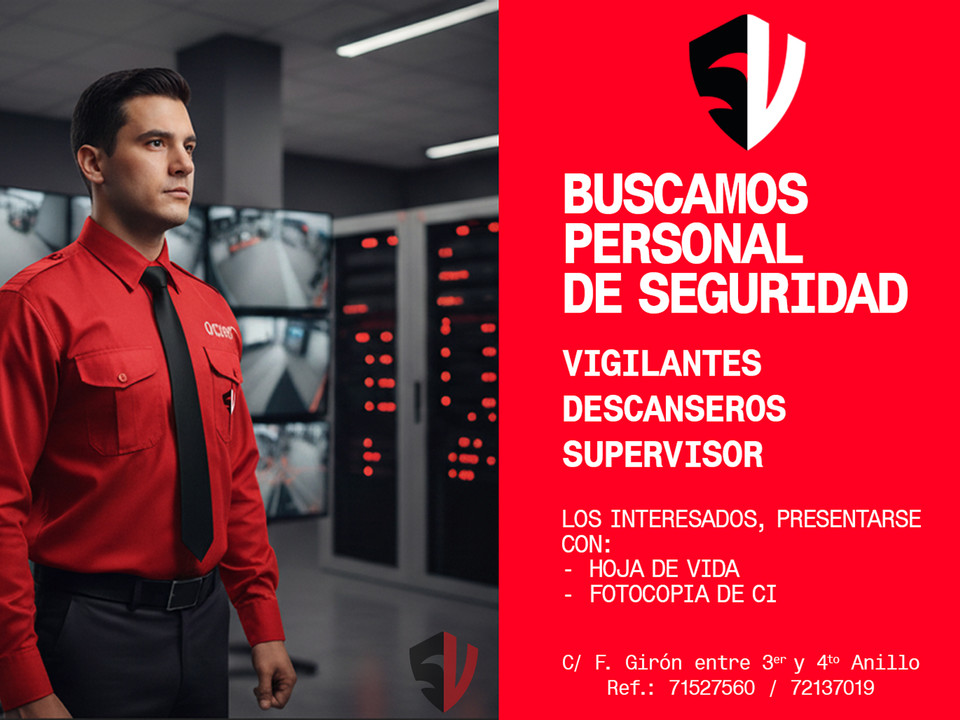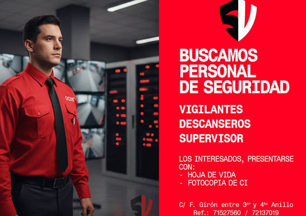EMPRESA DE SEGURIDAD LÍDER| en el mercado, busca: vigilantes, descanseros y Supervisor. Presentarse con CV y fotocopia de CI en C/ F. Girón entre 3er y 4to anillo. Ref: 64498642 (W006341917)