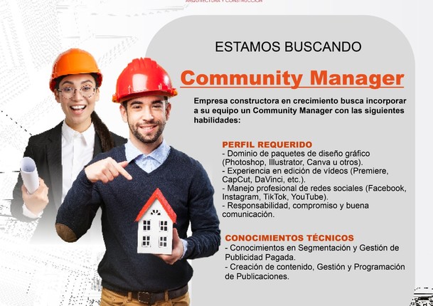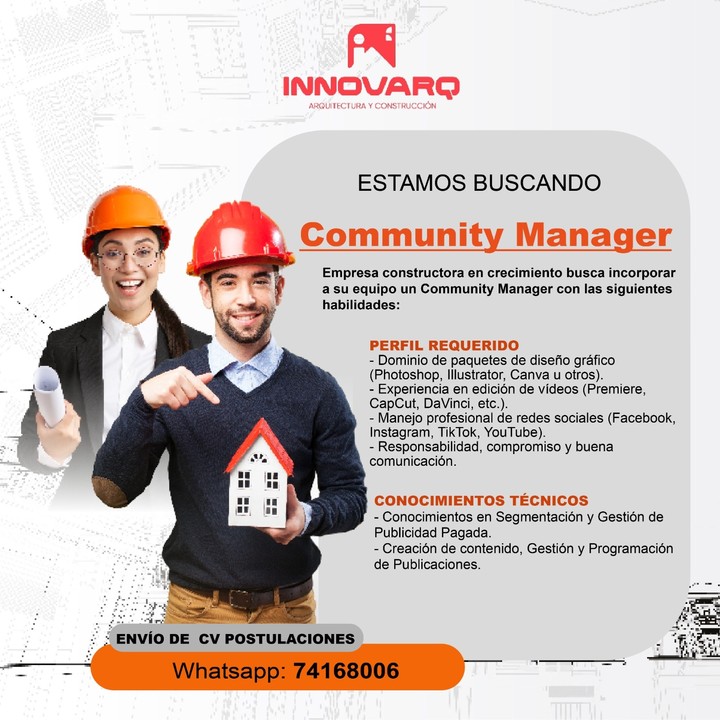 INNOVARQ ARQUITECTURA Y CONSTRUCCION| Estamos Buscando. Community Manager. Empresa constructora en crecimiento busca incorporar a su equipo un Community Manager con las siguientes habilidades: Perfil Requerido. Dominio de paquetes de diseño gráfico. (Photoshop, Illustrator, Canva u otros). Experiencia en edición de vídeos (Premiere, CapCut, DaVinci, etc.). Manejo profesional de redes sociales (Facebook, Instagram, TikTok, YouTube). Envío de cv postulaciones. WhatsApp: 71656607 (B000434087)
