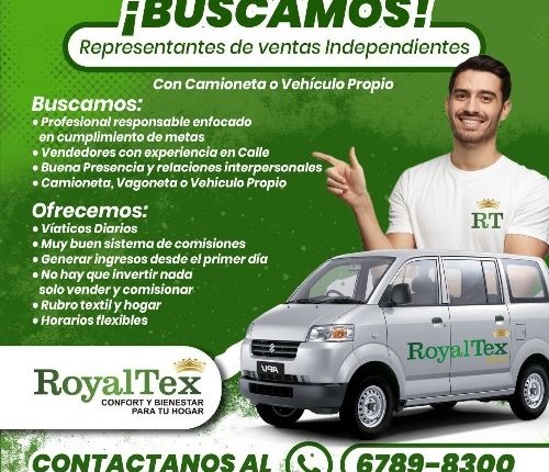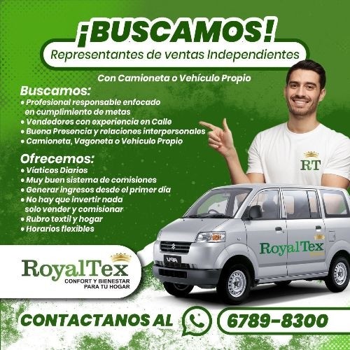 ROYALTEX MULTINACIONAL TEXTIL LIDER| en Latinoamérica busca Vendedores y Cobradores de calle con vehículo propio o moto / promotores / activadores / vendedores a pie / Cobradores con oficio moto propia serios y con experiencia comprobada. Excelentes ingresos y condiciones. Enviar directamente CV al 77348908 / 77308443 (B000405813)