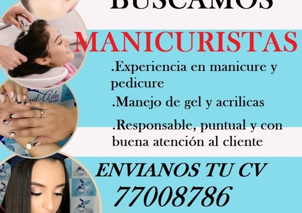 BUSCAMOS MANICURISTAS CENTRO- BELLEZA| en crecimiento requiere profesionales con experiencia en manicure, pedicure, gel y acrílicas. Valoramos puntualidad, responsabilidad y excelente trato al cliente. Envía tu CV al 77008786 (B000434475)