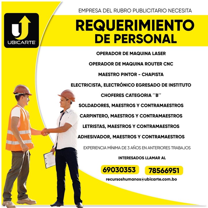 EMPRESA DEL RUBRO PUBLICITARIO| necesita: Requerimiento de personal: Operador de máquina láser. Operador de máquina router cnc. Maestro pintor - chapista. Electricista, electrónico egresado de instituto. Choferes categoría b. Soldadores, maestros y contramaestros. Carpintero, maestros y contramaestros. Letristas, maestros y contramaestros. Adhesivador, maestros y contramaestros. Experiencia mínima de 3 años en anteriores trabajos. Interesados llamar al 69030353 - 78566951 recursoshumanos@ubicarte.com.bo (B000432091)