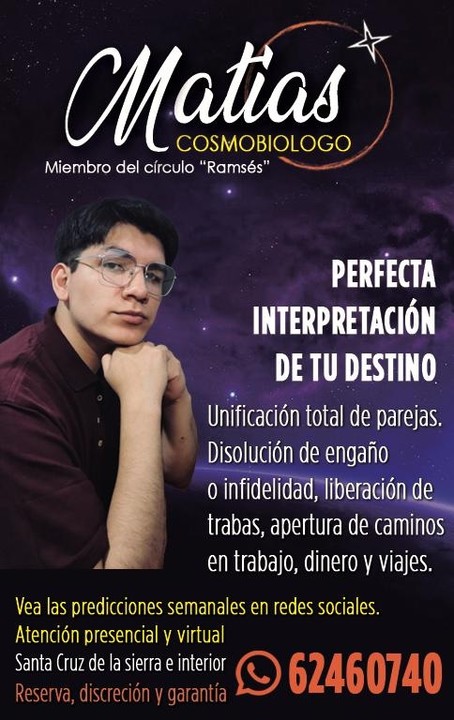 MATIAS COSMOBIOLOGO MIEMBRO | del círculo Ramsés perfecta interpretación de tu destino. Unificación total de parejas. Disolución de engaño o infidelidad, liberación de trabas, apertura de caminos en trabajo, dinero y viajes. Vea las predicciones semanales en redes sociales. Atención presencial y virtual. Santa Cruz de la sierra e interior. WhatsApp: 62460740. Reserva, discreción y garantía. (B000434669)