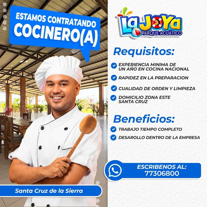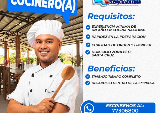 COCINERO(A), ESTAMOS CONTRATANDO | para restaurante a tiempo completo, si tienes experiencia de un año o más, pasión por el sabor boliviano, tienes rapidez, orden, limpieza, y vives en la zona Este de Santa Cruz. ¡esta es tu oportunidad! Beneficios: Trabajo a tiempo completo, Escríbenos al 77306800 y forma parte de nuestro equipo (W006295755)