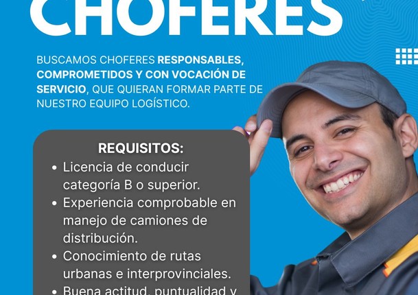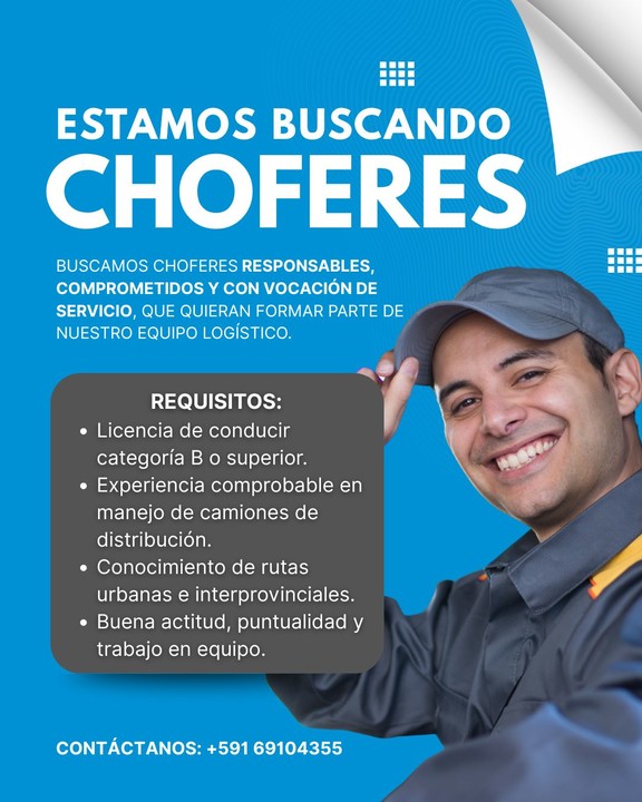 BUSCAMOS CHOFERES EN MULTICOMPRAS.| Requisitos: -Licencia de conducir categoría B o superior. -Conocimiento de rutas urbanas e interprovinciales. Contáctanos: +591 69104355 (W006325777)