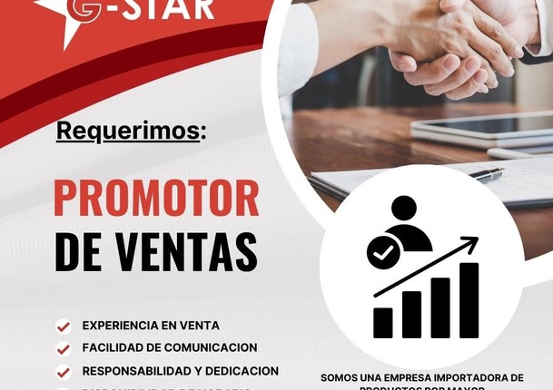 REQUERIMOS PROMOTOR DE VENTAS:| solamente con experiencia de 3 años en el rubro de Ventas por mayor en Electrodomésticos y línea blanca, Facilidad de comunicación, Responsabilidad y dedicación, Disponibilidad de horario. Con salario inicial de 4.000 Bs. Ref. 72659014 / 76061008 (B000435151)