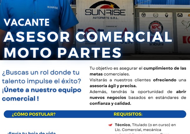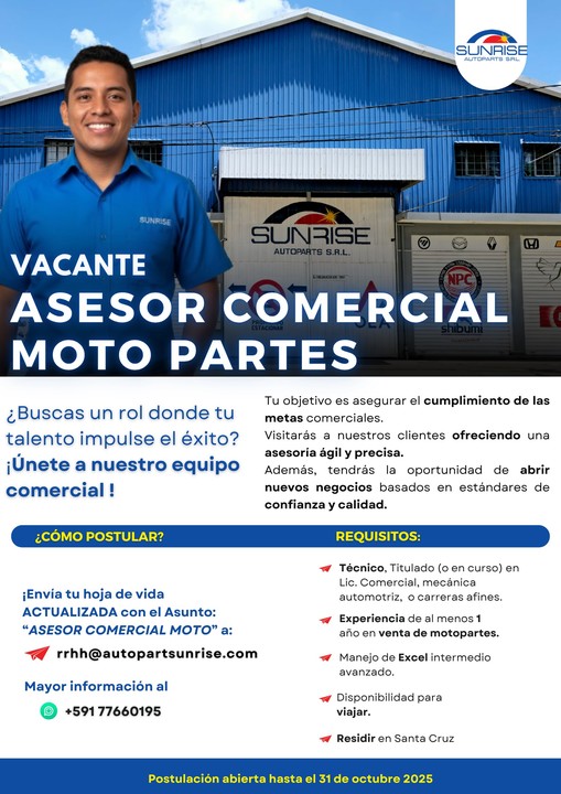 SUNRISE AUTOPARTS S.R.L. BUSCA| Asesor Comercial para ventas de motopartes para la ciudad de Santa Cruz. Requiere experiencia en el rubro y formación técnica. Envía tu CV actualizado a rrhh@autopartsunrise.com (W006326571)