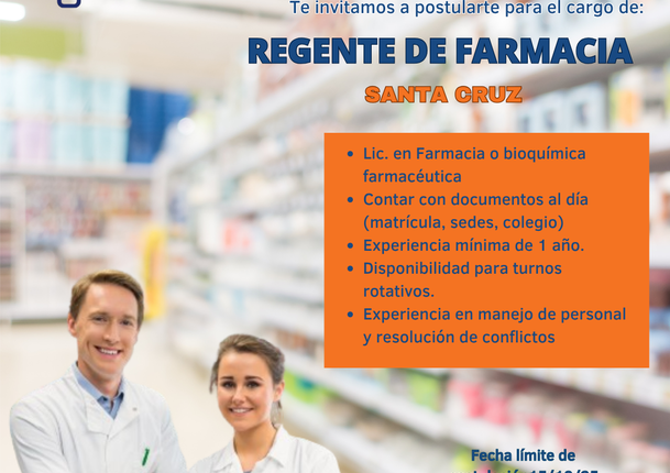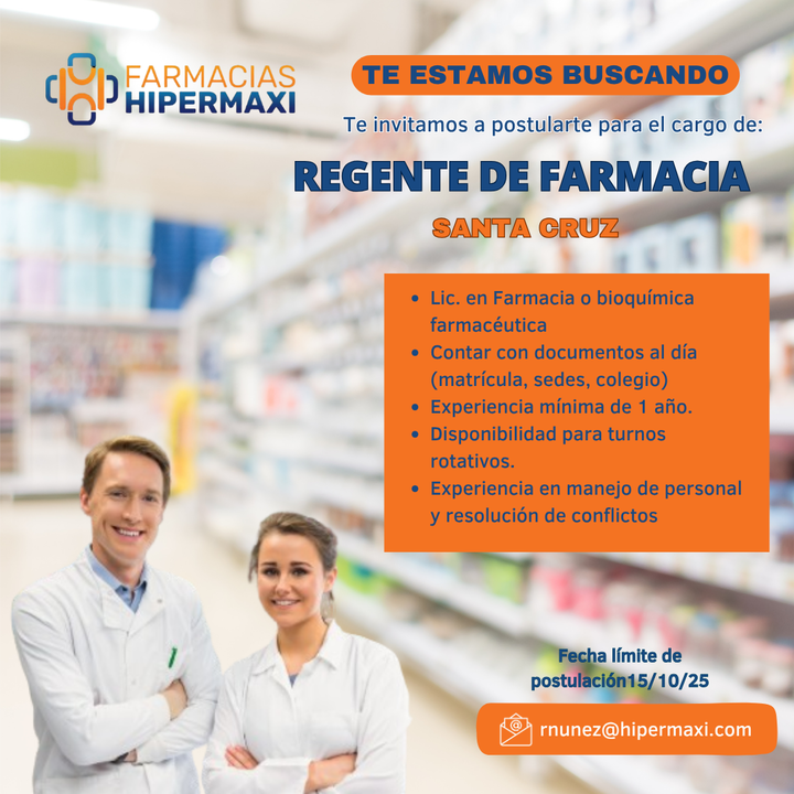 BUSCAMOS REGENTE DE FARMACIA:| licenciatura en Bioquímica y Farmacia o Farmacia, cuente con título en provisión nacional, matricula profesional, carnet del Sedes y del Col. de Bioquímica y Farmacia. Experiencia previa de un año, con disponibilidad para turnos rotativos. Interesados enviar su CV al correo: rnunez@hipermaxi.com (W006301797)