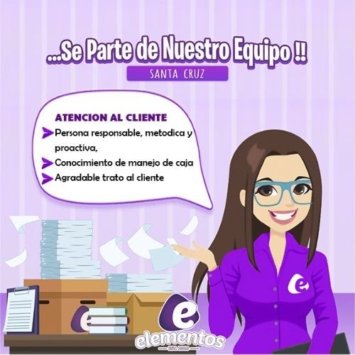 FORMA PARTE DE NUESTRO| EQUIPO necesitamos una persona con buena atención al cliente, conocimiento básico de caja y cuadre de stock interesados enviar su CV al 69101810 empresa Elementos S.R.L. (B000401395)
