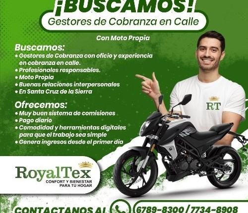 COBRADORES EN MOTOCICLETA RECIBE| Pagos diarios Si tienes tu Motocicleta y estás dispuesto a trabajar en Cobranzas en SCZ, eres la persona que estamos buscando. envíanos tu Hoja de Vida al Wsp 7780-8681 / 7730-8443 te programaremos una entrevista, Profesionales serios con Disciplina, Orden y Perseverancia la paga es diaria, también recibimos vendedores de calle, Importante empresa importadora corporativa. (B000418352)