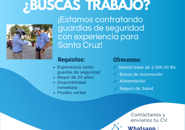 EMPRESA DE SEGURIDAD REQUIERE| contratar guardias con experiencia en Condominios para Santa Cruz. Se ofrece SLM desde 2.500 Bs. Más bonos de locomoción y alimentación. Postulantes deben ser mayor de 23 años y con experiencia. Interesados pueden coordinar una entrevista por WhatsApp al 65057550. (W006039108)