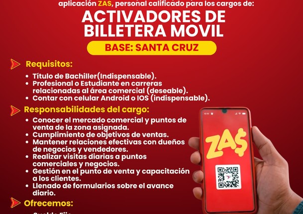 PUBLIMARCA AL SERVICIO DEL| BANCO económico necesita activadores de billetera móvil para promocionar la aplicación zas se requiere estudiantes o profesional en el área comercial, contar con celular y datos, se ofrece sueldo fijo más comisiones. contáctanos al 74607555 (W006310233)