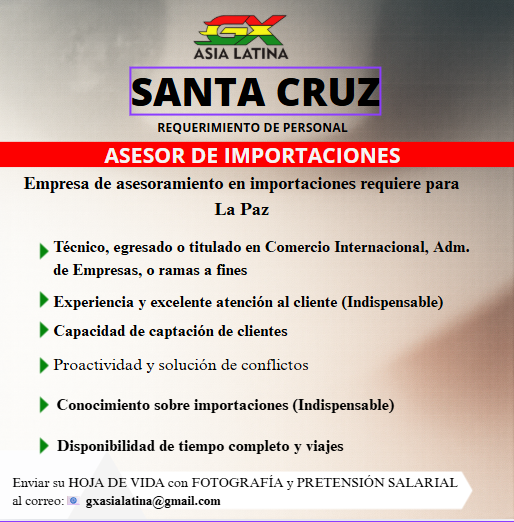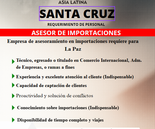 REQUERIMOS CARGO DE: ASESOR(A)| de Importaciones Requisitos: • Técnico(a), egresado(a) o titulado(a) de Comercio Internacional o ramas afines. • Experiencia y excelente atención al cliente (indispensable). • Capacidad en captación de clientes. • Conocimiento sobre importaciones (excluyente). •Disponibilidad de tiempo completo y viajes. • Interesados enviar CV adjuntando pretensión salarial al correo gxasialatina@gmail.com (W006360164)
