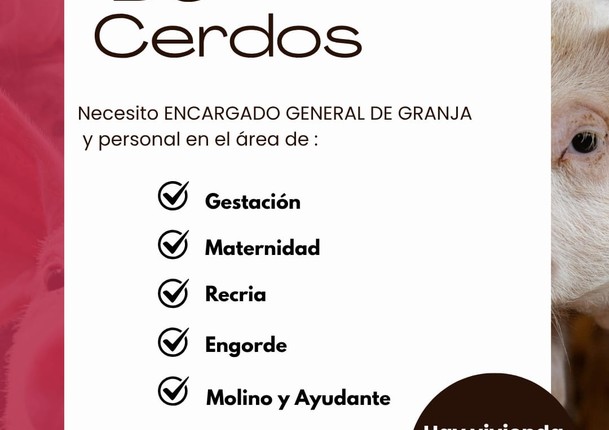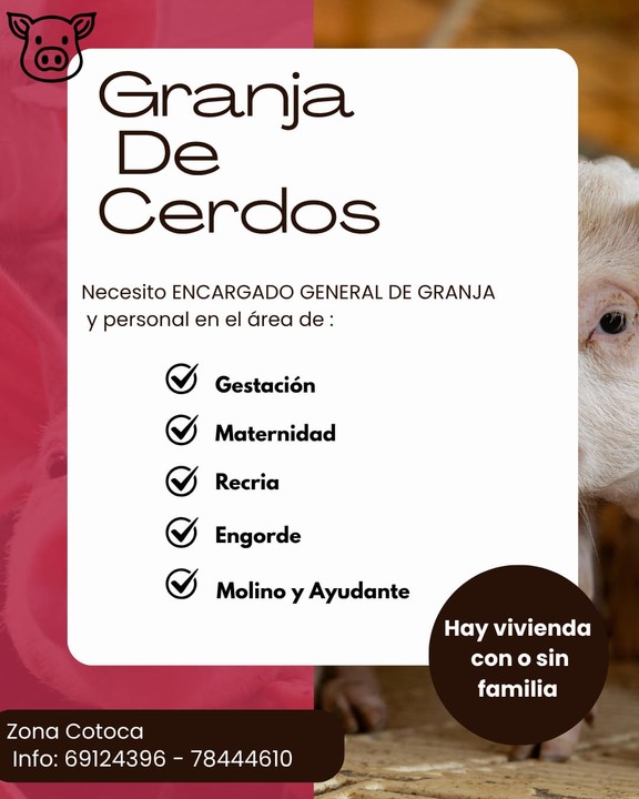 NECESITO ENCARGADO GENERAL | de granja y personal en el área de: Gestación, Maternidad, Recría, Engorde, Molino Y Ayudante. Hay vivienda, con o sin familia. Zona Cotoca Inf. 69124396 - 78444610 (W006332521)