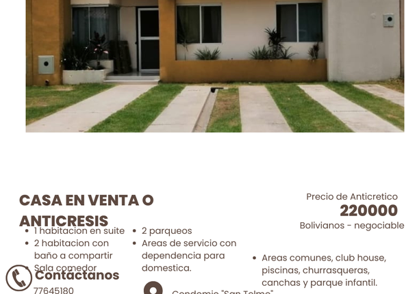 ANTICRÉTICO EN 22000 DOLARES,| Condominio San Telmo, Directo con propietario. Consta de cuatro habitaciones, tres baños, cocina amoblada, sala comedora. Clubhouse, parqueo. Cel: 71027838. (W006332546)