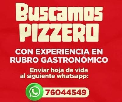 BUSCAMOS PIZZERO REQUISITOS:| Experiencia en preparación de pizzas- Conocimiento en manejo de horno y masas - Agilidad y limpieza en la cocina - Disponibilidad de horarios - Trabajo en equipo y responsabilidad. Enviar CV solo por WhatsApp al 76044549 (B000432514)