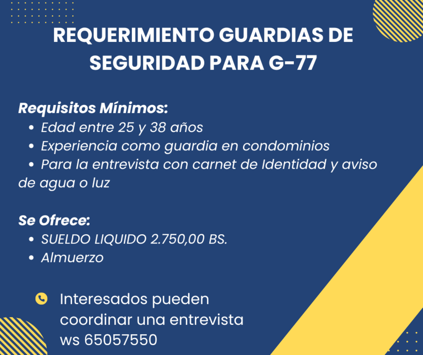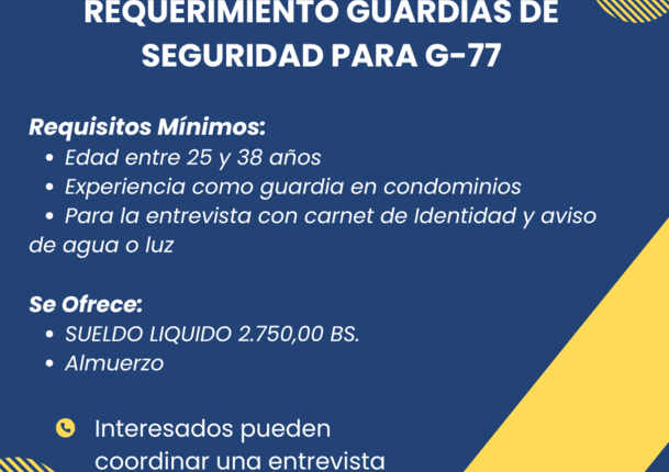 SE REQUIERE CONTRATAR GUARDIAS| con experiencia para Condominio en G77. Postulantes deben ser mayor de edad. Se ofrece SLM de 2750 a 3000 Bs. con almuerzo. Interesados pueden coordinar una entrevista por whatsApp al 65057550. (W006304335)
