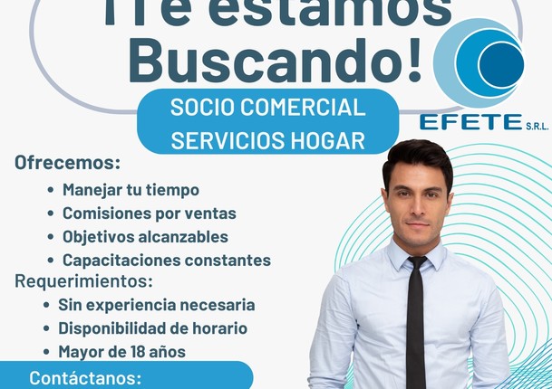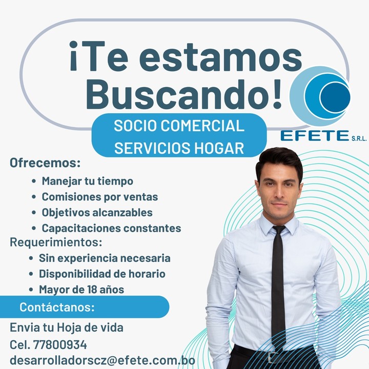 ¡CRECE JUNTO A NOSOTROS!| Buscamos Socios Comerciales, gente apasionada por la ventas, para representar a una importante empresa en ventas de Servicios Hogar. Manejas tu tiempo, Objetivos alcanzables. Ofrecemos capacitación, apoyo constante y excelentes comisiones.?? Contáctanos hoy: Cel. 77800934 - HDV a desarrolladorscz@efete.com.boefete — Crecemos juntos. (B000432339)