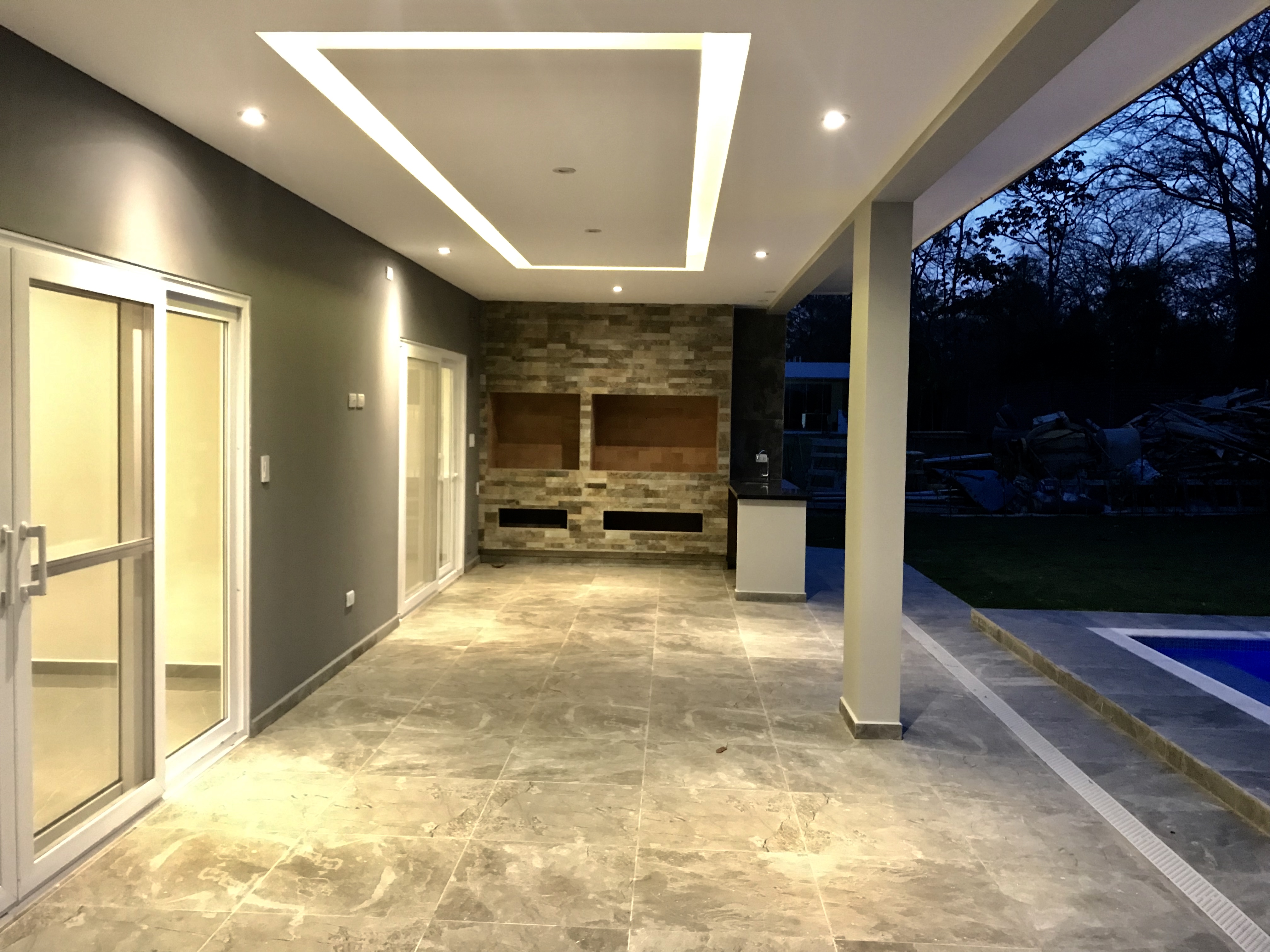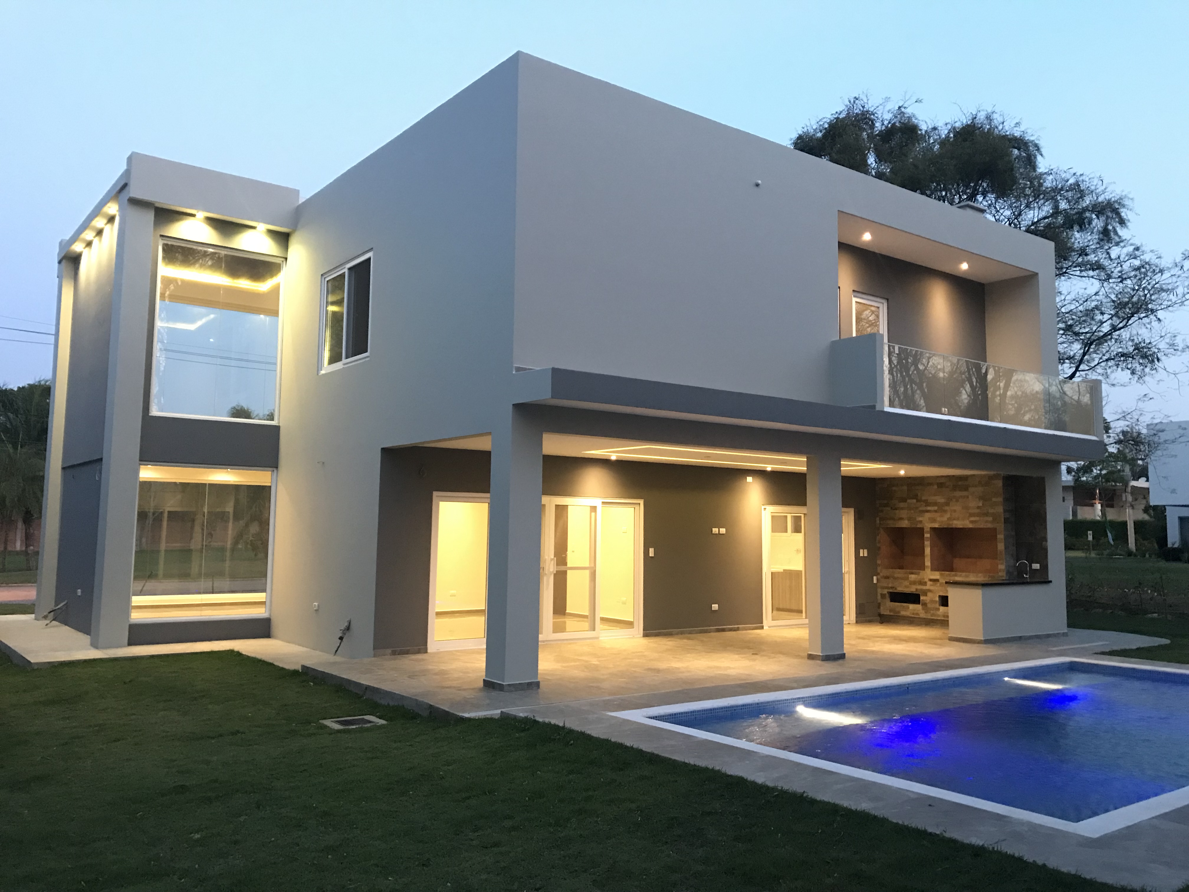 Vendo casa a estrenar, en condominio Rio Sierra zona Urubo, 3 dormitorios en suite, sala de estar, living, comedor, cocina, escritorio, churrasquera dependencias de servicio, depósito. Piscina, gas domiciliario, alcantarillado y riego automático.