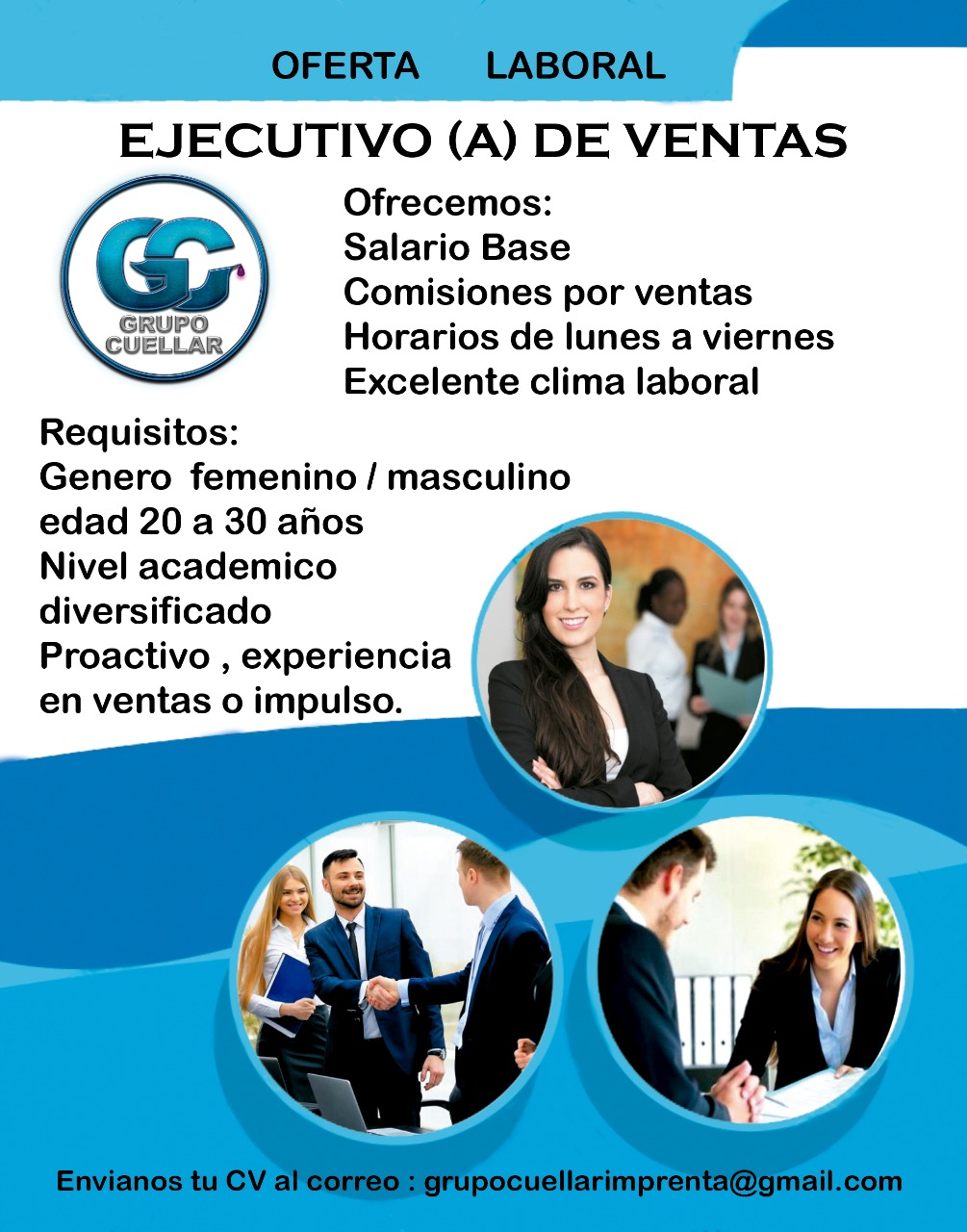 Grupo Cuellar Servicios Gráficos solicita 3 ejecutivo (a) de ventas , proactivos enfocados en el logro de objetivos , compromiso laboral, atención al cliente. Media jornada de lunes a viernes, sueldo base, más comisiones por ventas excelente clima laboral , WhatsApp 73614908