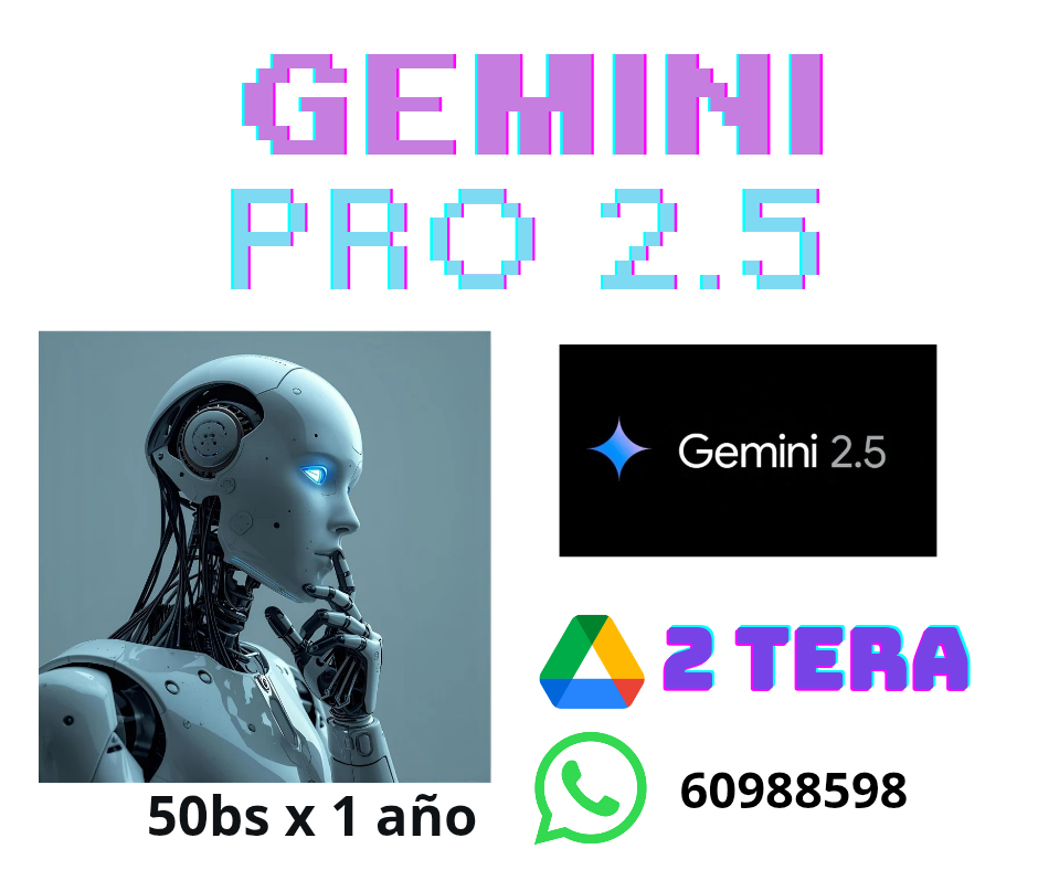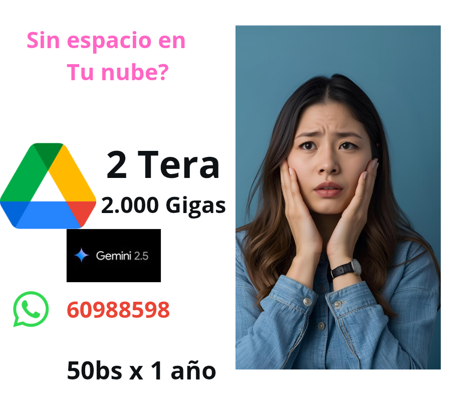 Te quedaste sin espacio para tus fotos, en la nube, obten 2 tera de espacio x tan solo 50bs 1 año entero, de regalo, gemini 2.5 pro, y mas, wp 609-88598, activacion inmediata.