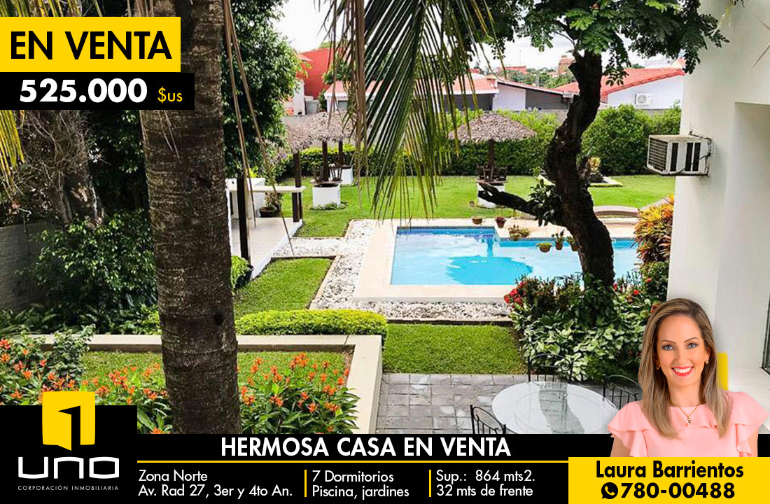 HERMOSA CASA EN VENTA, Z/Norte Av. Radial 27 entre 3er y 4to Anillo, sup. 864 m2 terr / 592 m2 const, 32 mts de frente, 7 dorms (2 suites), amplios jardines, piscina, churras, cabaña, galerias, depositos, gje p/4 veh, porton elect. Precio menor a su avaluo $us.525.000. Ref Uno: 78000488
