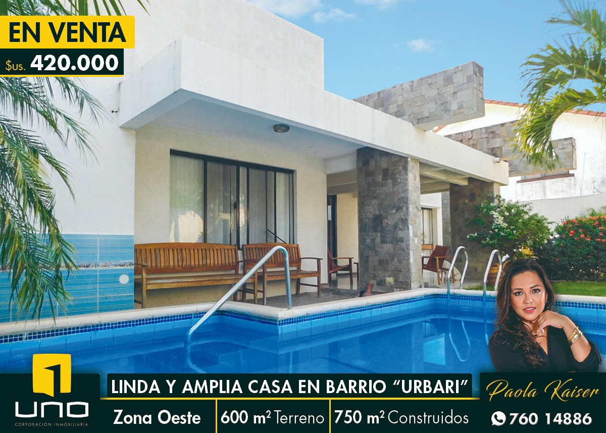 LINDA CASA CON PISCINA Zona Urbari 2/3 anillo, equipada, 600m2, 750 construidos, hall de ingreso, liv-comedor, cocina amplia, 6 dormitorios, área de servicio, deposito, churrasquera, galerías y jardín, 420.000$ Ref: 76014886 – 76099888