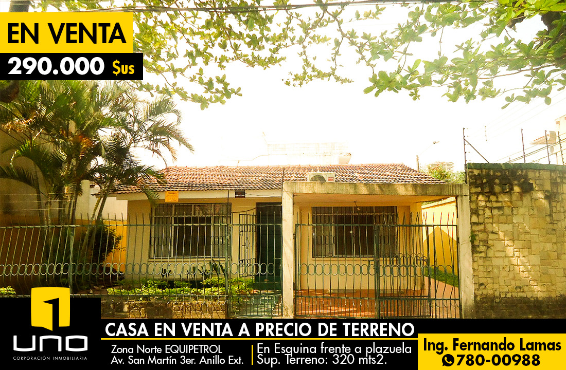 (casa en venta) CASA A PRECIO DE TERRENO, en esquina frente a plazuela, Z/Norte, en Equipetrol, Av. San Martin 3er Anillo, detrás del banco Unión, 1 planta, 320 m2 terreno / 200 m2 Const. 8 grandes ambientes, 3 baños, galería, patio, garaje y demás dpcias. $us.290.000.- Ref UNO 780-00488